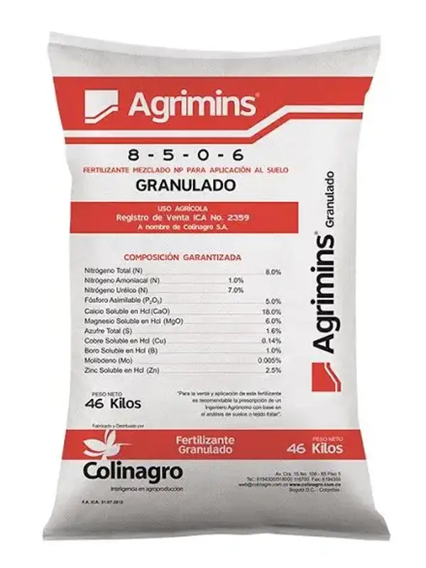 El nitrógeno presente en forma total, amoniacal y ureico contribuye al crecimiento vegetativo y a la síntesis de proteínas vegetales, mientras que el fósforo asimilable favorece la transferencia de energía y el desarrollo temprano del sistema radicular. El calcio y el magnesio actúan como elementos estabilizadores de paredes celulares y cofactors en múltiples rutas metabólicas, y el potasio junto con los micronutrientes soporta funciones fisiológicas esenciales como la regulación hídrica, la activación enzimática y la síntesis de metabolitos secundarios que implican vigor y sanidad de la planta. AGRIMINS Granulado se utiliza en cultivos extensivos e intensivos tales como café, cacao, arroz, papa, hortalizas y pastos, ayudando a equilibrar la nutrición del cultivo y aumentar rendimiento y calidad cuando se aplica en conjunción con análisis de suelo y prácticas agronómicas recomendadas.