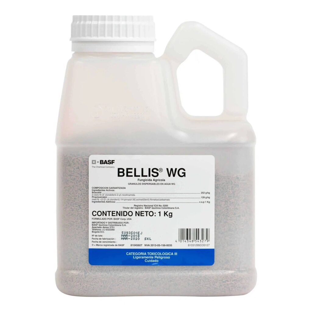 Bellis WG es un fungicida agrícola altamente eficaz elaborado como granulado dispersable en agua, formulado con boscalid y pyraclostrobin, dos ingredientes activos que actúan sobre diferentes puntos del metabolismo de los hongos fitopatógenos. El boscalid pertenece al grupo de las carboxamidas y ofrece acción sistémica, protectora y curativa al inhibir la respiración fúngica en el complejo II de la mitocondria, reduciendo la energía disponible para el crecimiento del hongo. El pyraclostrobin, una estrobilurina, actúa a nivel translaminar y de contacto interrumpiendo la respiración en otro sitio de la mitocondria, lo que ayuda a prevenir y limitar la germinación de esporas, el crecimiento de micelio y la esporulación, ofreciendo así un control prolongado y eficaz contra múltiples enfermedades.