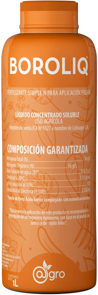 Fertilizante Foliar BOROLIQ es un fertilizante líquido foliar de alta concentración que combina boro y nitrógeno, formulado para corregir y prevenir deficiencias de boro en cultivos agrícolas. Está especialmente indicado para aplicaciones durante la floración y el llenado de frutos, favoreciendo la nutrición de tejidos vegetales, el fortalecimiento de tallos y la mejora de procesos reproductivos.
