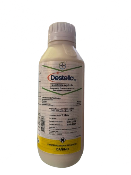 Destello es un insecticida formulado como suspensión concentrada (SC) que combina dos ingredientes activos —thiodicarb y triflumuron— con mecanismos complementarios para proporcionar un control técnico y prolongado de insectos plaga. El thiodicarb actúa afectando el sistema nervioso del insecto mediante la inhibición de la acetilcolinesterasa, provocando la acumulación de acetilcolina y la eventual parálisis y muerte de individuos expuestos. Por su parte, el triflumuron interfiere en la síntesis de quitina, un componente esencial de la cutícula durante las mudas larvales, impidiendo que los insectos completen el desarrollo normal y reduzcan su supervivencia al cambiar de estadio.