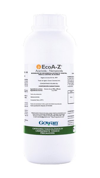 ECOAZ de Gowan es un bioinsumo agrícola de origen vegetal elaborado a partir de extractos botánicos altamente concentrados, que combina mecanismos de acción por repelencia, irritación y efecto nematostático, proporcionando control eficaz sobre ácaros fitófagos comunes (como Tetranychus urticae y Oligonychus spp.) y un efecto preventivo frente a nemátodos fitoparásitos del suelo (Meloidogyne spp. y otros) que afectan raíces y vigor general del cultivo.