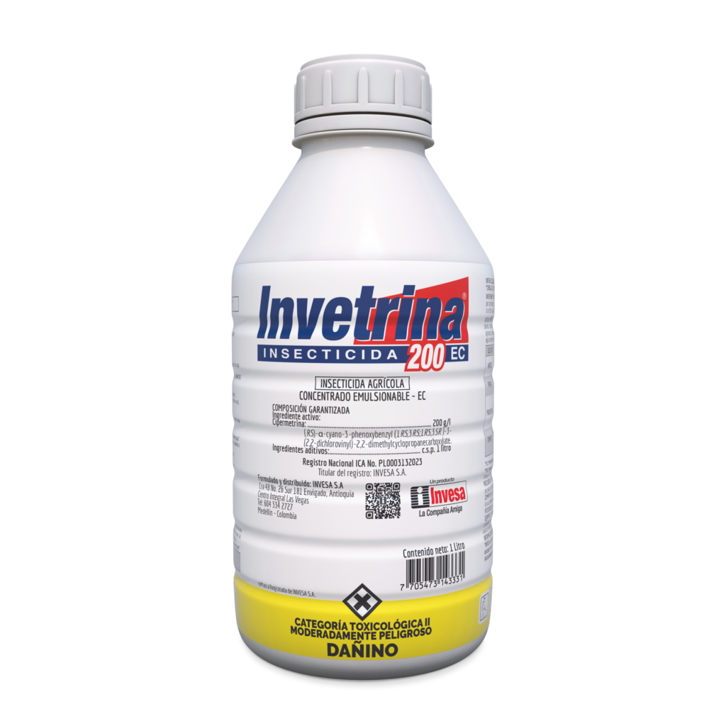Invetrina 200 EC de Invesa es un producto agrícola desarrollado para el manejo profesional de plagas insectiles que afectan una gran variedad de cultivos agrícolas, combinando eficacia de contacto e ingestión con una acción residual prolongada que ayuda a reducir las poblaciones de insectos plaga de manera sostenida. Su ingrediente activo, cipermetrina (200 g/L), es un compuesto perteneciente al grupo químico de los piretroides, que actúa sobre el sistema nervioso central de los insectos bloqueando los canales de sodio, lo que provoca parálisis progresiva, detención de la alimentación y la muerte del organismo objetivo. Esta acción neurotóxica hace que el producto sea eficaz contra insectos chupadores, masticadores y algunas plagas que se desplazan entre hojas y tallos, favoreciendo un control amplio y efectivo que protege las partes vitales de la planta como hojas, brotes y frutos frente a daños severos.