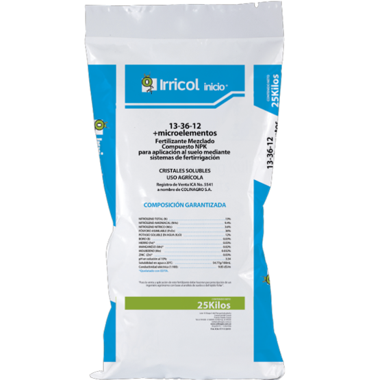 Irricol Inicio es un fertilizante agrícola hidrosoluble de alta disponibilidad, formulado con un balance técnico de nitrógeno, fósforo y micronutrientes diseñado para favorecer el establecimiento vigoroso de plántulas, desarrollo radicular temprano y crecimiento inicial, aportando una nutrición precisa cuando las plantas más lo requieren.