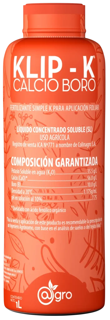 Fertilizante Klip K Calcio Boro es un fertilizante agrícola foliar soluble que combina calcio y boro en formas altamente disponibles para la planta, diseñado para corregir deficiencias de ambos elementos y favorecer procesos fisiológicos claves como la formación de paredes celulares, floración, cuajado de frutos y calidad de cosecha, especialmente en cultivos sensibles a desequilibrios nutricionales.