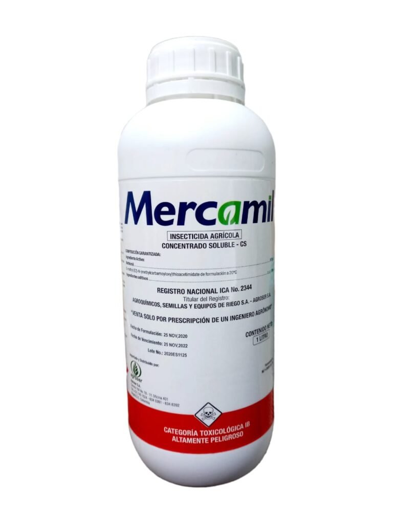 Mercamil es un insecticida agrícola perteneciente al grupo químico de los carbamatos, con ingrediente activo methomil, diseñado para el control técnico de insectos plaga por contacto y por ingestión. Actúa rápidamente sobre plagas masticadoras y chupadoras, reduciendo su alimentación y reproducción para proteger el follaje y órganos productivos del cultivo.