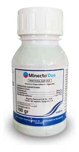 Minecto Duo 40 WG de Syngenta es un insecticida agrícola formulado en gránulos dispersables en agua (WG) con dos ingredientes activos de distinto modo de acción, diseñado para el control eficaz y prolongado de insectos plaga que afectan una amplia gama de cultivos hortícolas y de campo. Su formulación combina actividad de contacto, ingestión y sistémica translaminar, lo que permite que el producto penetre en los tejidos vegetales y proporcione protección interna y residual, reduciendo agresivamente las poblaciones de insectos responsables de daños visibles en hojas, tallos y frutos, y favoreciendo el vigor y productividad de las plantas tratadas en etapas críticas de su ciclo productivo.