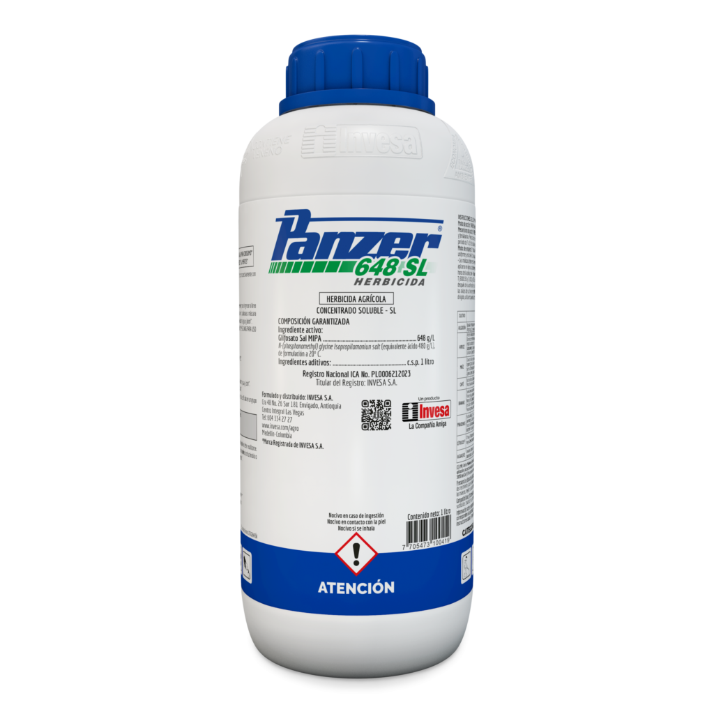 Panzer 648 SL es un herbicida agrícola no selectivo y sistémico, formulado como concentrado soluble (SL) con glifosato (648 g/L) como ingrediente activo. Está diseñado para eliminar malezas emergidas, tanto gramíneas como dicotiledóneas, en barbechos, preparación de suelo, potreros y aplicaciones dirigidas donde se requiere desecar vegetación no deseada con alta eficacia.