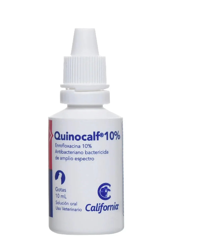 Quinocalf Gotas 10% es un antibiótico bactericida de amplio espectro basado en enrofloxacina, indicado para el tratamiento de infecciones respiratorias, digestivas, genitourinarias y cutáneas en aves, perros y gatos. Su presentación líquida permite una administración oral fácil y eficaz, garantizando la rápida acción contra bacterias sensibles.