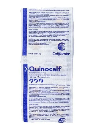 Quinocalf Pasta es un antibiótico fluoroquinolona de amplio espectro que contiene enrofloxacina como principio activo, eficaz contra bacterias Gram-positivas y Gram-negativas, incluyendo E. coli, Salmonella, Staphylococcus, Streptococcus y Mycoplasma. Está indicado para el tratamiento de infecciones respiratorias, digestivas, genitourinarias y cutáneas en terneros, aves de producción, perros y gatos.