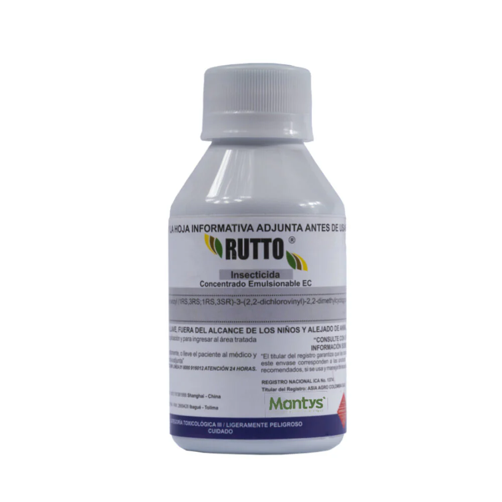 Rutto es un insecticida agrícola de amplio espectro del grupo de los piretroides, formulado como concentrado emulsionable (EC) con cyfluthrin como ingrediente activo. Está diseñado para el control rápido y eficaz de insectos rastreros y voladores en sistemas productivos, instalaciones y granos almacenados, actuando por contacto e ingestión para eliminar plagas que reducen la sanidad y rendimiento de cultivos o productos almacenados.