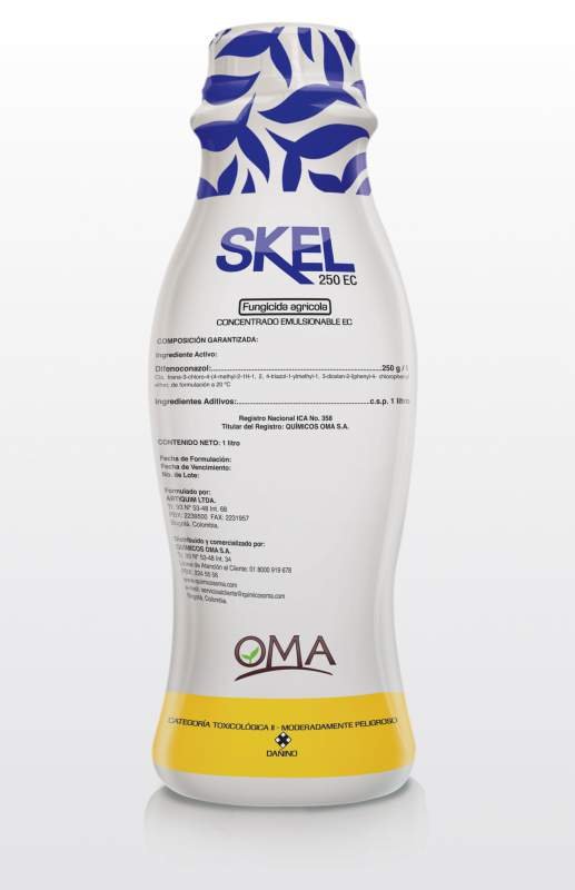 Skel 250 EC es un fungicida agrícola sistémico y de contacto, formulado como concentrado emulsionable (EC) con difenoconazol (250 g/L) como ingrediente activo. Está diseñado para el control preventivo y curativo de enfermedades fúngicas que afectan una amplia variedad de cultivos, inhibiendo el desarrollo del patógeno y protegiendo tanto el tejido tratado como el nuevo crecimiento de la planta.
