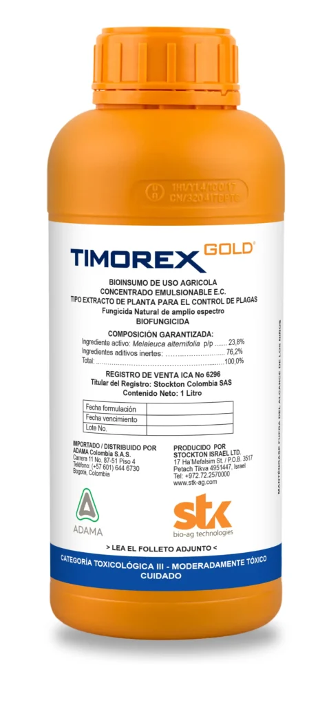 Timorex Gold es un fungicida agrícola botánico, desarrollado a partir de extractos naturales del árbol de té, que ofrece una alternativa eficaz para el control de enfermedades causadas por hongos en diferentes sistemas productivos. Su modo de acción se basa en la alteración de la membrana celular de los patógenos, afectando procesos esenciales como la respiración y el crecimiento del micelio, lo que limita la propagación de la enfermedad y reduce la presión de infección en el cultivo.
